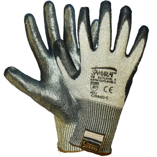 Global Glove CR800 Samurai Tsunami Tuff Nitrile Glove, Cut Resistant, 2X-Large, Gray/Black (Case of 72) . Global Glove CR800 provides the latest technology in comfort and cut resistant gloves. The Samurai CR800 incorporates Taeki5 technology uses a revolutionary duracore spinning process and an innovation silicon reinforced fiber. The technology advancements in our engineered yarn bring you the exceptionally high cut resistant without sacrificing dexterity and tactile sensitivity. Specially formulated Tsunami Grip Tuff nitrile. Nitrile affords excellent oil and chemical resistance. Dexterity and comfort are the best available in this level of cut resistance. This super lightweight shell provides EN 388 level 5 and ASTM level 4 cut resistance, comfort and the ability to dip into many chemicals to retrieve sharp objects. Perfect for handling sharp objects such as sheet metal, glass or razor sharp steel. General purpose. Gray and black liner color. Coating color: black. Coating composition: nitrile palm. Smooth exterior finish. Elasticized knitwrist cuff finish. Taeki5 liner provides excellent cut resistance and dexterity. Black hides soil, extending glove wear life. Ergonomically designed forms provide naturally curved, relaxed fit to reduce hand fatigue. Provides good wet and dry grip. Applications: assembly involving small sharp components, automotive, white goods, plastics, glass. 2X-Large size.