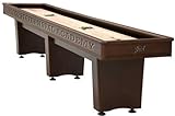 Navy Midshipmen Mahogany 9' Shuffleboard Table. The Cabinet: This is probably the most noticeable difference between our shuffleboard game table and what is currently available. Most tables are only 1 piece, while our cabinet is a 2 piece unit with a top & bottom apron. The top apron is made of 1½" thick solid hardwood with the university's logo engraved at each end. The bottom apron is made of ¾" solid hardwood wood that not only enhances the look of the table but adds to its durability. The cradle at each end is completely carpeted inside with cut outs for climatic adjusters. The Playfield: This unit comes with a lightweight climatic adjuster and comes with a 1 year warranty. Our playfield surface is made of commercial grade solid Canadian hard rock maple with 4 - 4" climatic adjusters. Each end of the 16" wide playfield is screen printed with the university's logo and the entire surface is protected with multiple coats of clear epoxy creating a beautiful and long last playing surface that comes with a lifetime warranty. The Optional Scoring Unit: It comes with a single control for scoring and rounds mounted right on scoring unit positioned above the center of the table. Our unit is an 18" octagon that has a two sided display positioned above the center of the table and comes complete with separate controls on each end of the game table for scoring, rounds and reset. The Legs: They are made of boxed hardwood with accessory shelves attached and mounted through the cradle for better stability and come with adjustable levelers. The finish on the game table currently offered is laminated fir plywood while our table has a hand rubbed traditional mahogany finish giving it the look of fine furniture. Delivery Times: Each shuffleboard table is custom made for you. It takes 3 weeks to make the table and then 1 week to ship it to you. Holiday season can stretch the times by as much as another week.