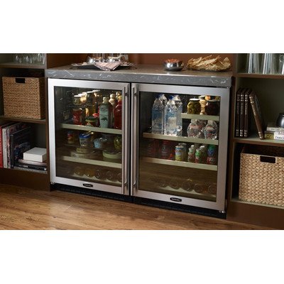 24" Wine and Beverage Cooler Finish: Black Cabinet With Stainless Frame Glass Door, Hinge: Left, Lock: With No Lock . 6BARM-BS-G-L Finish: Black Cabinet With Stainless Frame Glass Door, Hinge: Left, Lock: With No Lock Features: -One of Marvel's most popular and versatile performers has just become a lot more stylish. The 6BARM provides the best of both worlds in one beautiful model, featuring distinct temperature zones for both wine and beverage storage..-Two temperature zones for wine storage and beverage refrigeration.-Exclusive MicroSentry refrigeration monitor has a visual/audible alarm to alert if the temperature goes above or below the set point for an extended time which may impact storage quality or if the door is left ajar.-Amber LED display shows content temperature in real time.-Intuitive touch controls are discreetly located for understated elegance.-Shelves and wine racks extend smoothly, with built-in safety stops.-One coated wire shelf with dual flip-up sections for vertical storage of 2-liter and opened wine bottles, two removable tempered glass shelves, one extendable wine rack and one stationary wine cradle provide storage for all your beverage needs.-Elegant interior lighting may be set for continuous illumination with one-touch control.-Door swing requires only 90 opening to extend racks.-You may also order your beverage refrigerator with a door that accepts a custom overlay frame supplied by your cabinet maker. The Marvel overlay frame is one of the simplest to install.-Full auto defrost. Construction: -Door is constructed of argon-filled, dual-pane, tinted UV-resistant glass to display contents while protecting them from damaging UV rays. Color/Finish: -Clear, solid white maple trim on rack fronts is perfect for custom finishing to match cabinetry.-Clean, continuous toe kick adds a stylish finish.-Three distinctive colors: monochromatic black with black interior, monochromatic white with white interior, or stainless steel framed door with black cabinet and black interior.